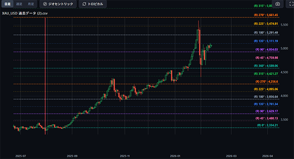 チャート上に描画されるラインは、角度の重要度に応じて色分けされています。