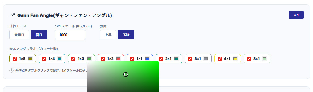 設定パネルの「Gann Fan Angle」項目にある「OFF」ボタンをクリックして「ON」に切り替えます。