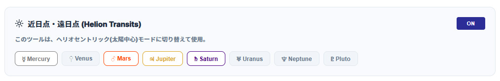 チャート分析画面の設定パネルにある「月の遠地点・近地点 (Apogee & Perigee)」の「OFF」ボタンをクリックして「ON」に切り替えます。