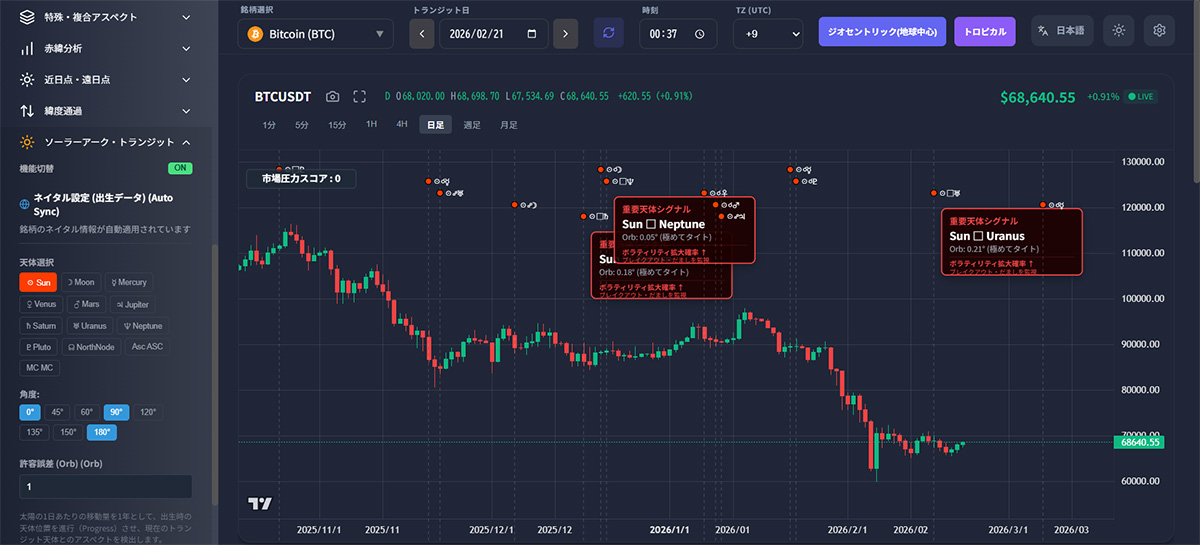 • 市場圧力スコアによるボラティリティ予測:ハードアスペクトや外惑星の関与を数値化した「市場圧力スコア」を参照し、スコアが高い時期を相場に強い負荷がかかる警戒期間として活用します。