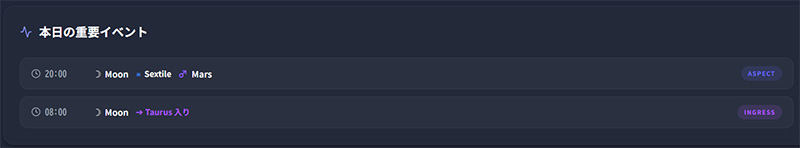 トランジット日の主要な天体イベント一覧を表示します。