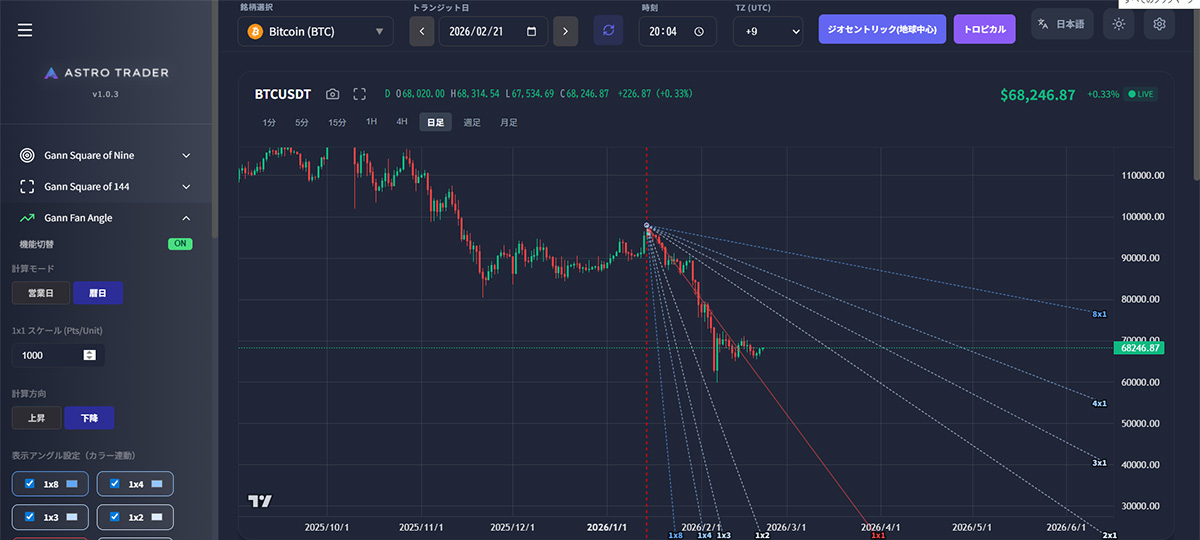 1×1ライン(1x1Scale)よりも価格が上に位置していれば強気相場、下に位置していれば弱気相場と判断され、他の角度のライン(1×2, 1×4, 1×8など)は、トレンドの加速や減速、あるいは反転のタイミングを示唆する動的なサポートおよびレジスタンスとして機能します。