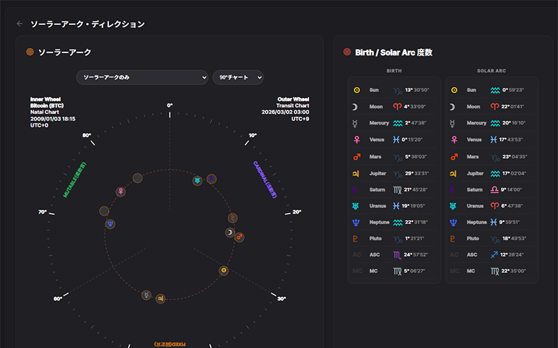 ネイタル、トランジット、二重円(ネイタル×トランジット)チャートを表示。