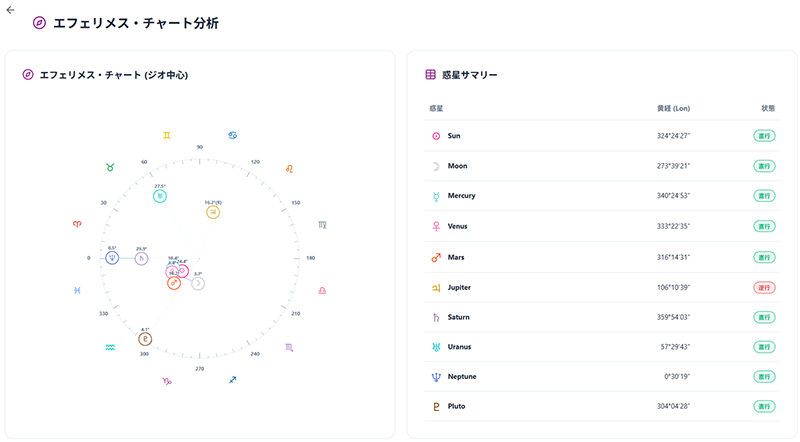詳細データのリスト化: チャートと連動し、各惑星の名称、シンボル、正確な黄経(Lon:度分表示)、および運行状態(直行・逆行)を一覧表で表示します。