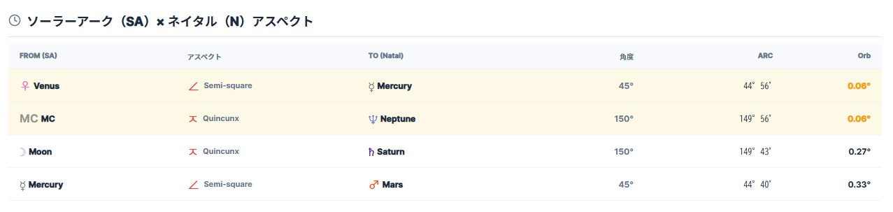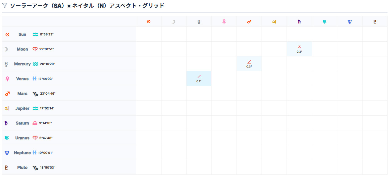 現在の日付におけるSA天体とネイタル天体のアスペクトを一覧表示します。