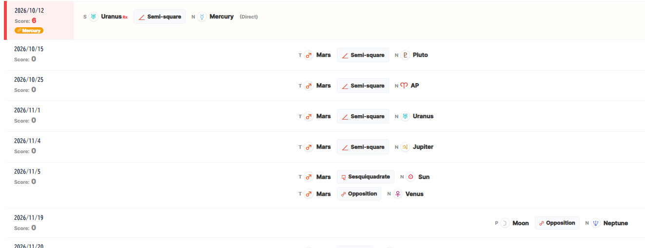 タイムラインの下には、現在のトランジット日における「SA × Natal」の全アスペクトリストおよびグリッド(相関図)が表示されており、当日の星回りを多角的に深掘りできます。