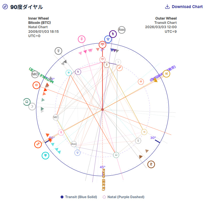 ビットコイン(BTC)などのボラティリティが高い資産を分析する場合、これらの軸、特に火星/土星にトランジットの天体が正確なオーブで重なるタイミングは、市場の「急落」や「トレンドの死」を予見する重要な指標となります。