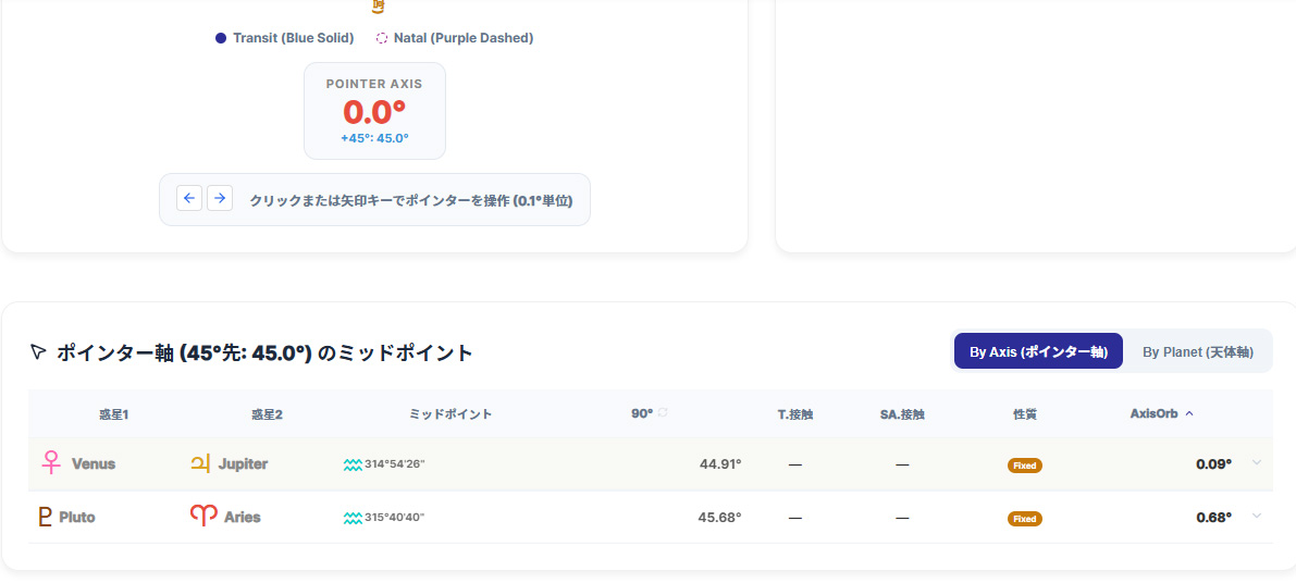 By Planet (天体軸): 特定の天体(T.SunやSA.Plutoなど)を基準に、どのミッドポイントを刺激しているかを逆引き分析します。