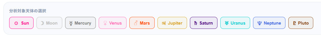 画面上部の惑星ボタンをクリックすることで、特定の天体(太陽、月、水星など)のみを分析対象に絞り込んだり、すべて表示したりすることが可能です。